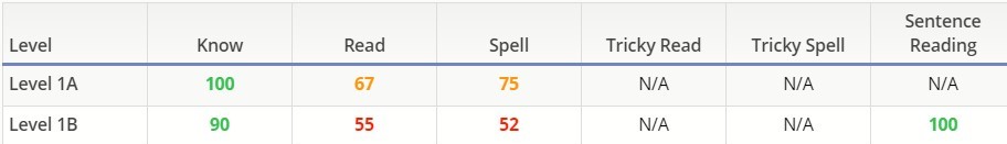 Nonsense Words are made-up words, like ‘fip’ or ‘bep’; they check a child can accurately decode. If your child has red and orange scores in Nonsense Word Reading, you should make sure they are blending accurately. It’s not necessary to teach nonsense words in isolation but you might like to download the Nonsense Word List to have a go on paper.